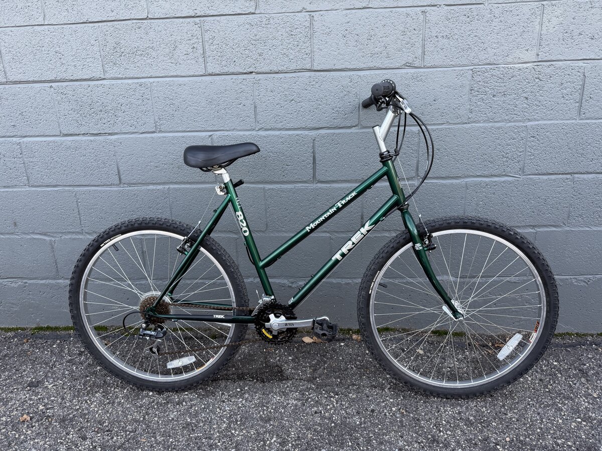 Our 1990s Trek Mountain Track 820 is a durable and reliable steel-frame mountain bike built during Trek’s golden era. This vintage bike features a chromoly frame, 21-speed Shimano drivetrain, 26" wheels, and cantilever brakes — perfect for casual rides, light trails, or city commuting.